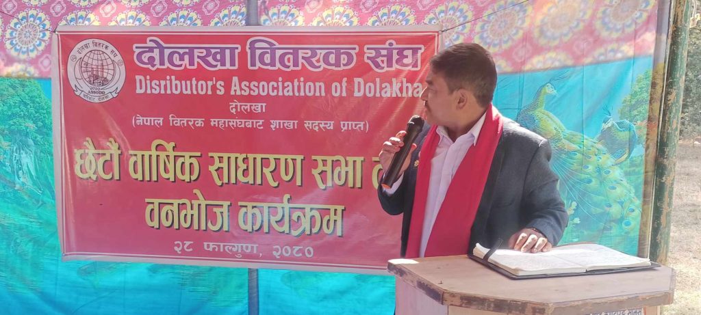 दोलखाका होलसेल , थोक तथा डिलर व्यवसाय गर्ने व्यवसायीहरुको छाता संगठन दोलखा वितरक संघको छैटौं वार्षिक साधारण सभा भब्यतापुर्वक सम्पन्न भएको छ । चरिकोटस्थित खोर्थली सामुदायिक वनको पिक्नीक स्पोर्टमा आयोजित साधारणसभाको सोमबार एक भब्य समारोहका बिच नेपाल वितरक महासंघका केन्द्रिय महासचिब राजकुमार श्रेष्ठले उद्घाटन गरेका थिए । उद्घाटन कार्यक्रममा महासचिब श्रेष्ठले डिलर व्यवसायीहरुका अप्ठयारोमा सरकार निरिह रहेको भन्दै यो व्यवसायलाई समयअनुकुल बनाएर अघि बढ्न सरकारसँग आग्रह गरेका छन् । उनले वर्षौदेखि सरकार मुकदर्शक बनेर बसेको आरोप लगाउदै तत्काल व्यवसायीका साझा समस्यालाई सम्बोधन गर्न आग्रहसमेत गरेका छन् । दोलखा वितरक संघका अध्यक्ष राजकुमार खड्काको अध्यक्षतामा सम्पन्न साधारणसभाले दोलखाको आन्तरी पर्यटनलाई प्रबद्र्धन गर्न र समुन्नत दोलखा निर्माण गर्न आगामी २०८१ साललाई दोलखा भ्रमण वर्षका रुपमा अघि बढाउन निजी क्षेत्रको प्रतिनिधित्व गर्दै मातहतका निकायहरुलाई आह्वान समेत गरेको छ । अध्यक्ष खड्काले दोलखाको खस्किदो अर्थतन्त्र र सुस्ताउदै गरेको पर्यटनलाई उकास्न निजी क्षेत्रको तर्फबाट आफुहरुले भ्रमण वर्षको घोषणा गरी कार्यन्वयन गर्न प्रस्ताब गरेको बताए । कार्यक्रममा भीमेश्वर नगरपालिकाका मेयर इश्वर मानन्धरले त्यसबारे नगरको कार्यपालिकामा प्रस्ताब लगि आबश्यक प्रकृया अघि बढाउने जनाएका छन् ।